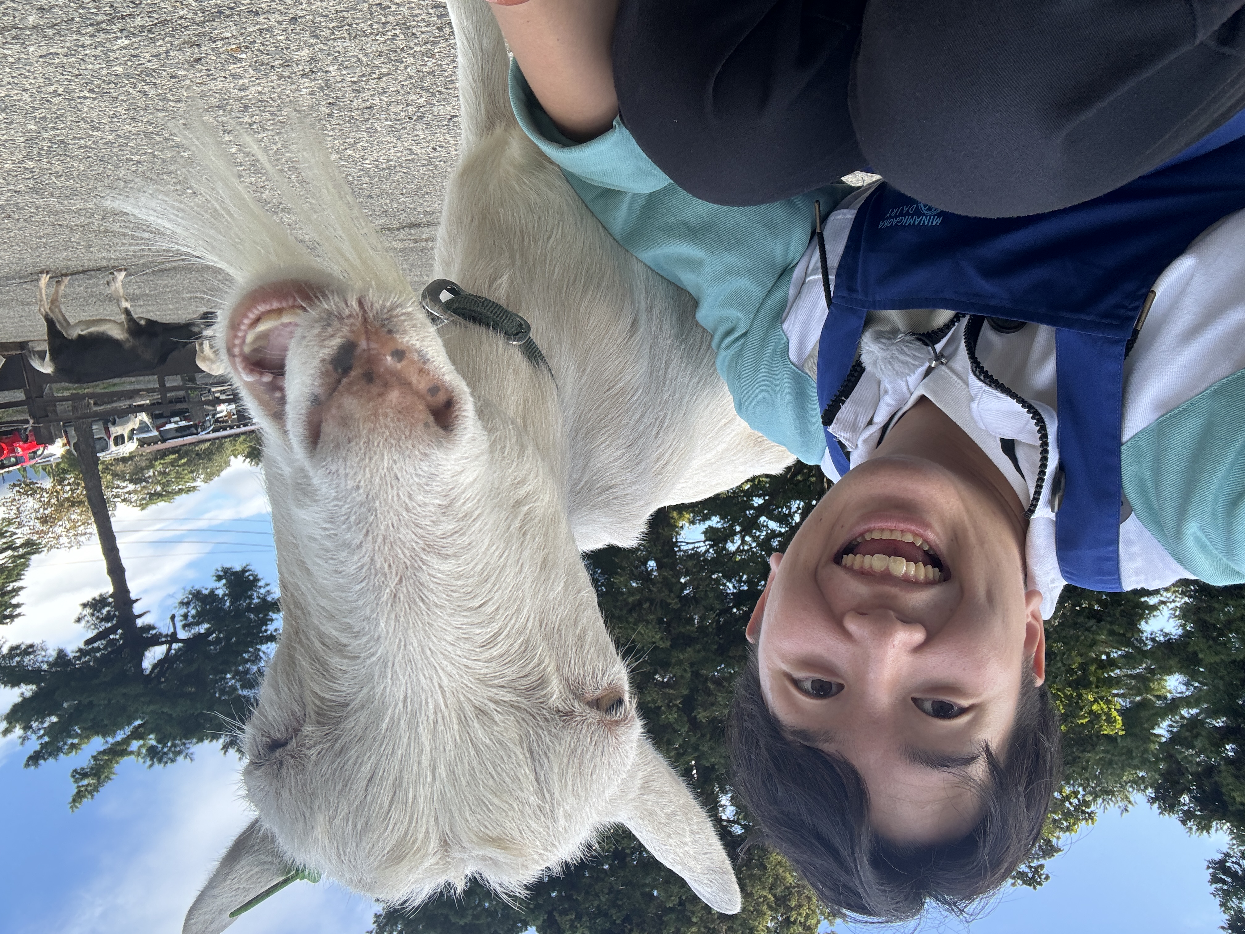 写真のヤギさんとのツーショット、最近のお気に入りなんです。