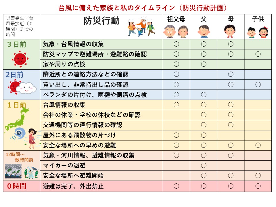 「防災大百科」の防災マイスター松尾一郎さんが提唱する家族のタイムラインです。